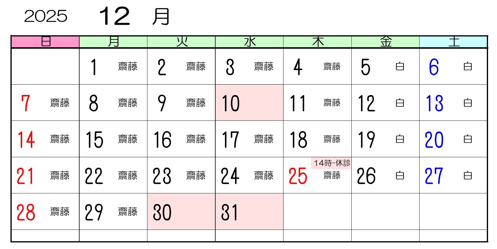 12月の休診日、ならびに外来担当となります。ご確認くださいませ。