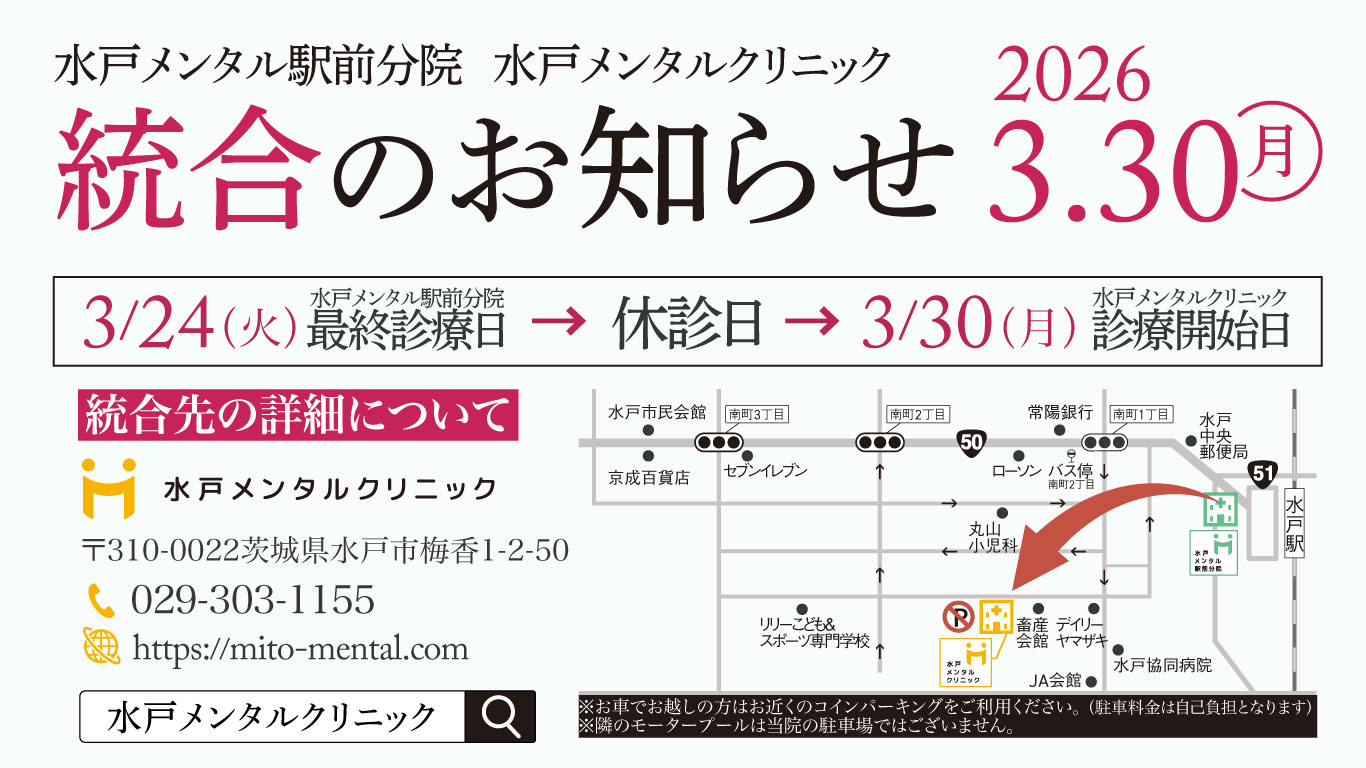 この度、「水戸メンタル駅前分院」と「水戸メンタルクリニック」は、2026年3月30日(月)より統合、新たな体制でのスタートを迎える運びとなりました。