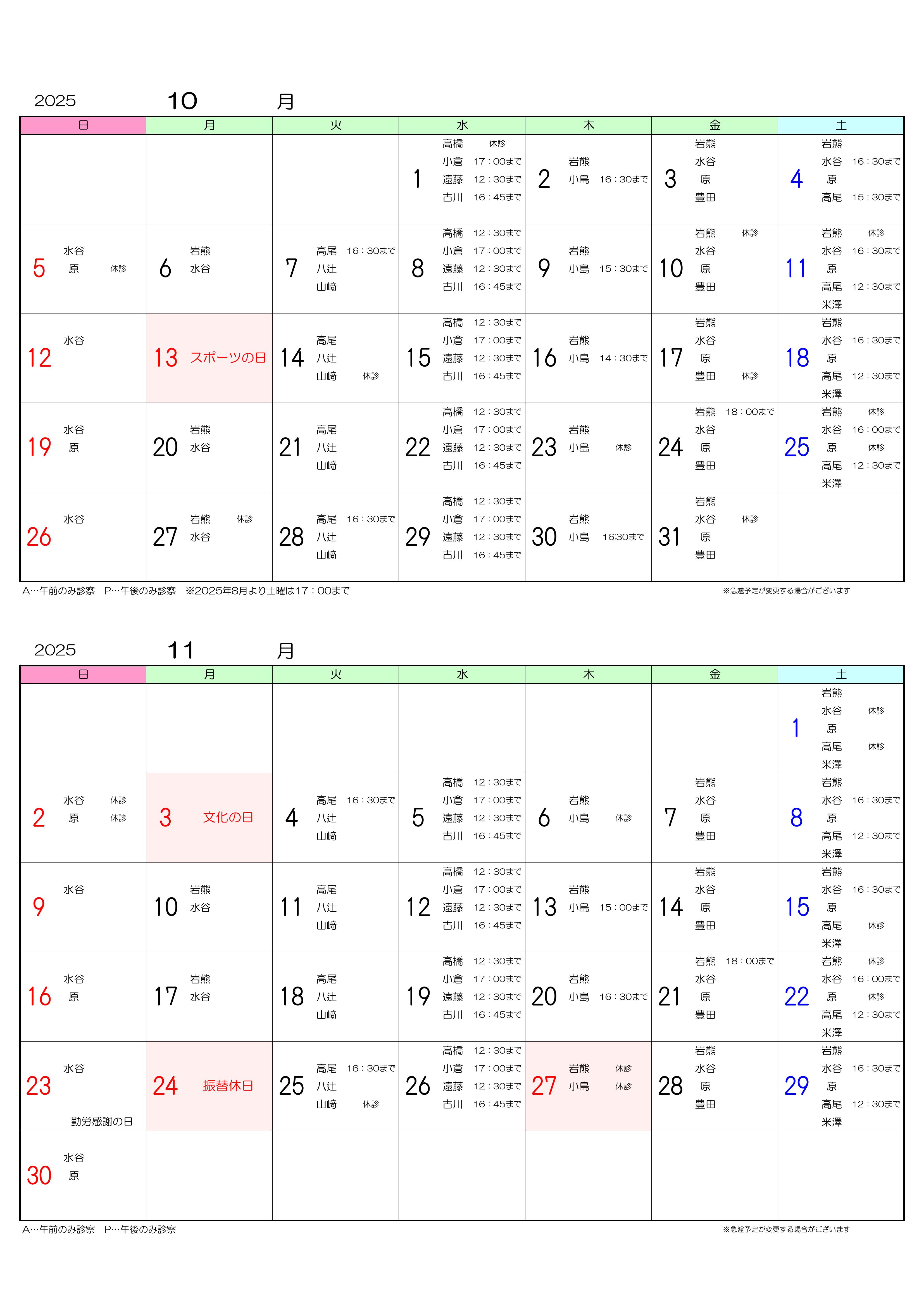 10月・11月の外来担当表となります。ご確認くださいませ。【 PDFファイルで確認する 】下記の「くわしく見る」からも、PDFファイルでもご確認いただけます。どうぞよろしくお願いいたします。