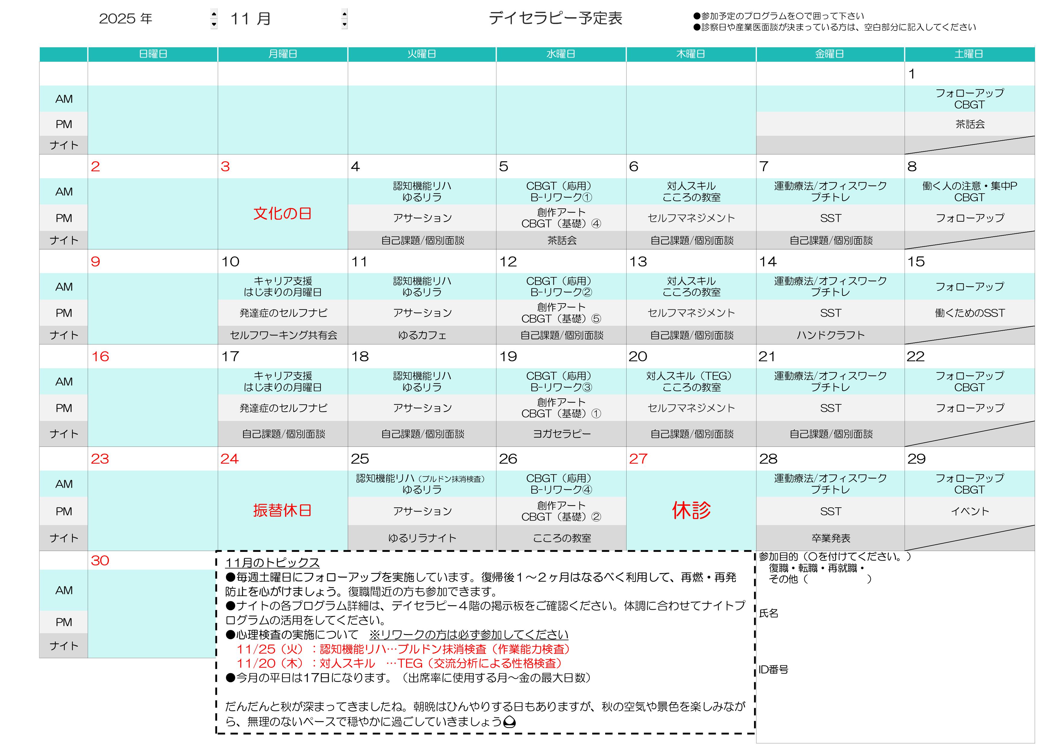11月のデイセラピー予定表を掲載いたします。ご確認ください。また下記よりPDFファイルでご確認いただけます。【PDFファイル】