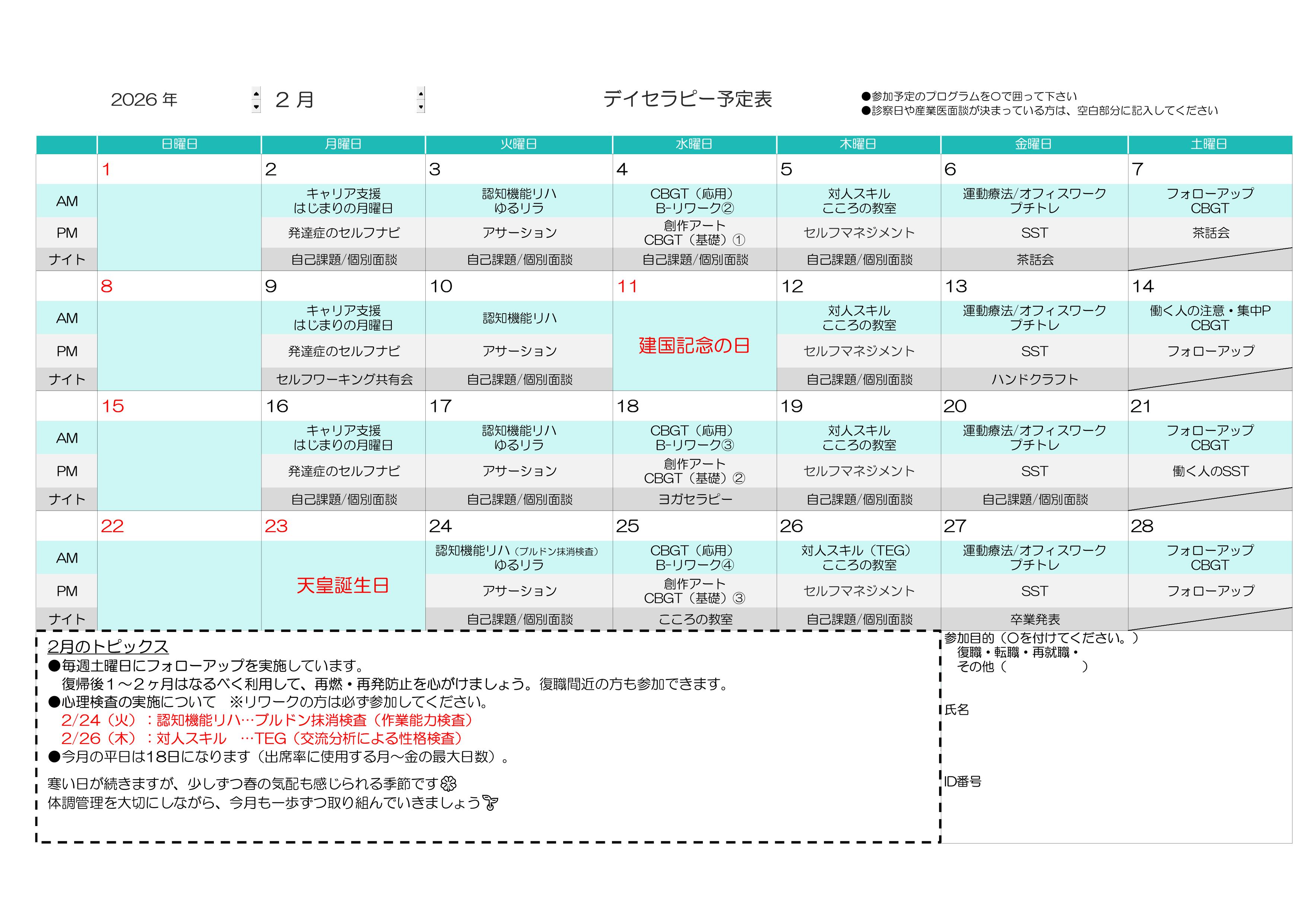 2月のデイセラピー予定表を掲載いたします。ご確認ください。また下記よりPDFファイルでご確認いただけます。