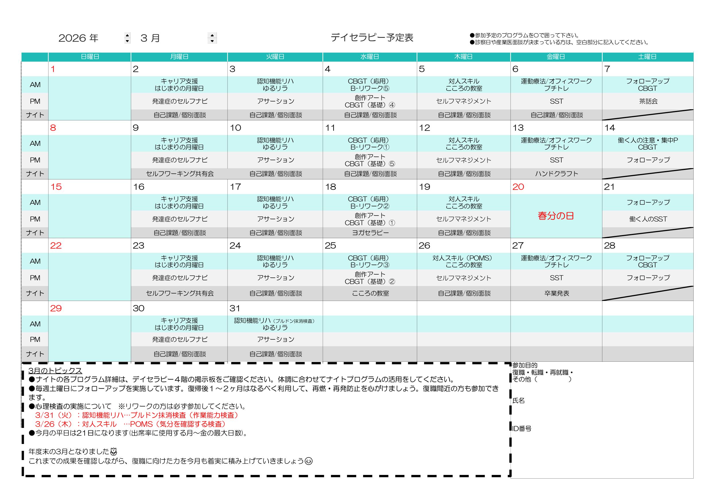 3月のデイセラピー予定表を掲載いたします。ご確認ください。また下記よりPDFファイルでご確認いただけます。