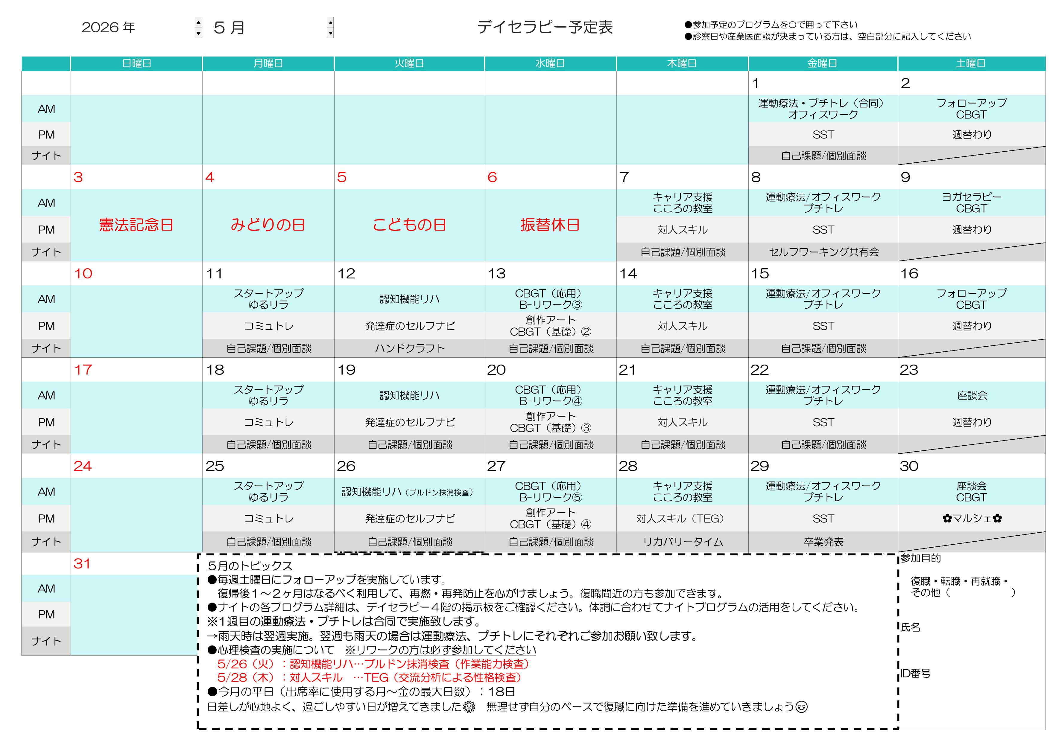 5月のデイセラピー予定表を掲載いたします。ご確認ください。また下記よりPDFファイルでご確認いただけます。